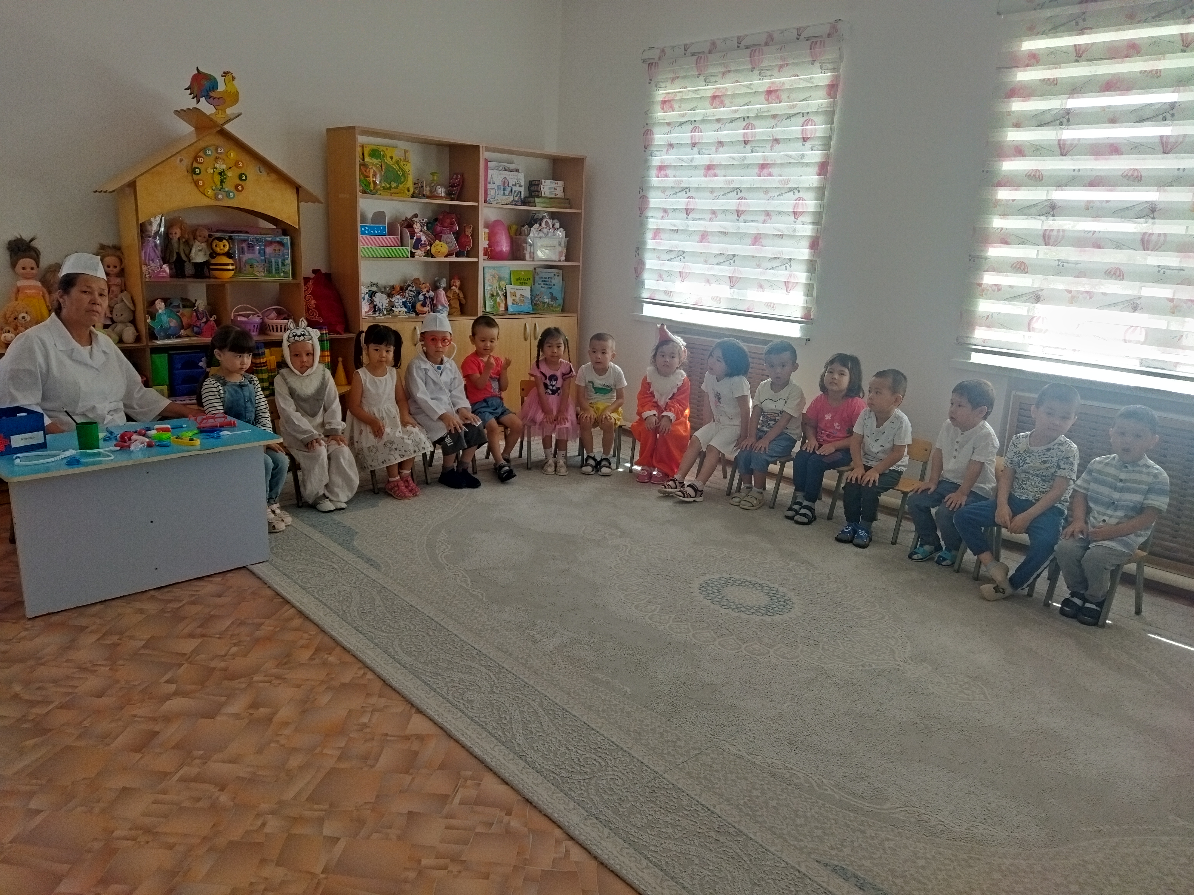 Атырау облысы Білім беру басқармасының Атырау қаласы білім бөлімінің N32 "Мөлдір" бөбекжай-бақшасы коммуналдық мемлекеттік қазыналық кәсіпорны Жазғы сауықтыру іс-шараларының жоспарына сай "Балапан" ортаңғы тобында "Айболит бізде қонақта" тақырыбында балалармен сюжетті рольдік ойын өткізілді.