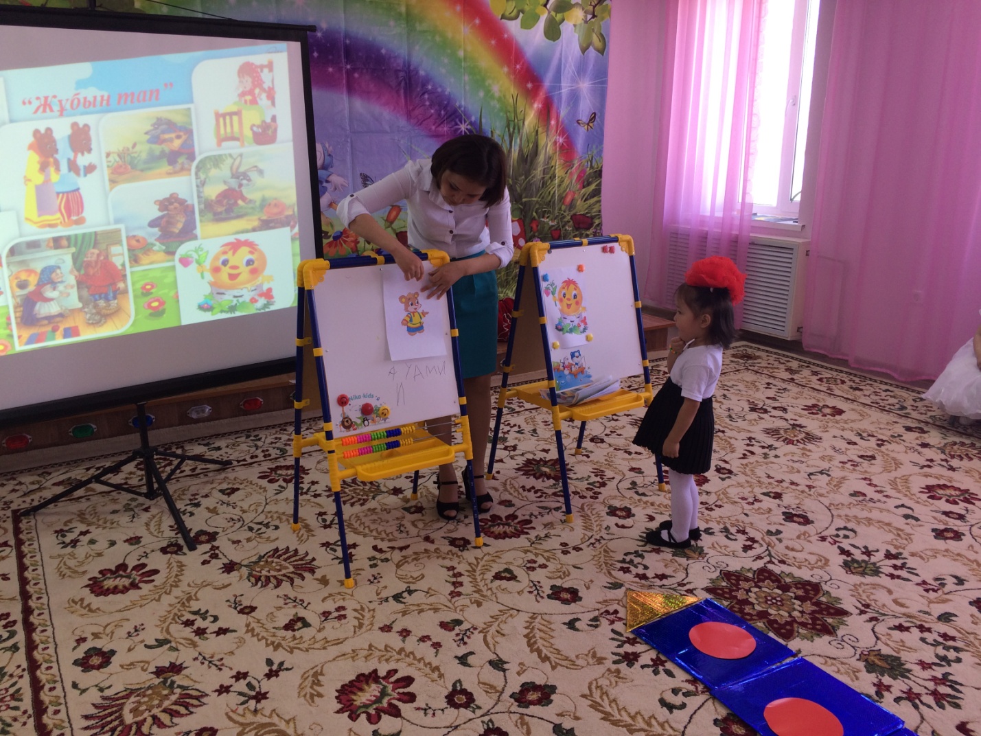 Билингвалді компонент: зымыран - ракета, ай - луна, жұлдыз - звезда, күн - солнце, бұлт - туча.