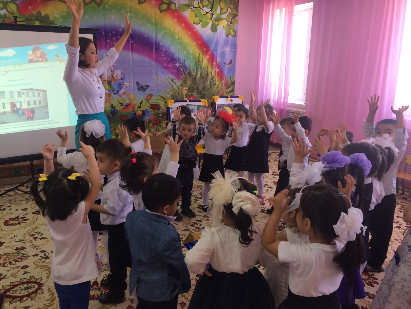 Балалар шеңберге жиналып, бірге қайталап айтады. |