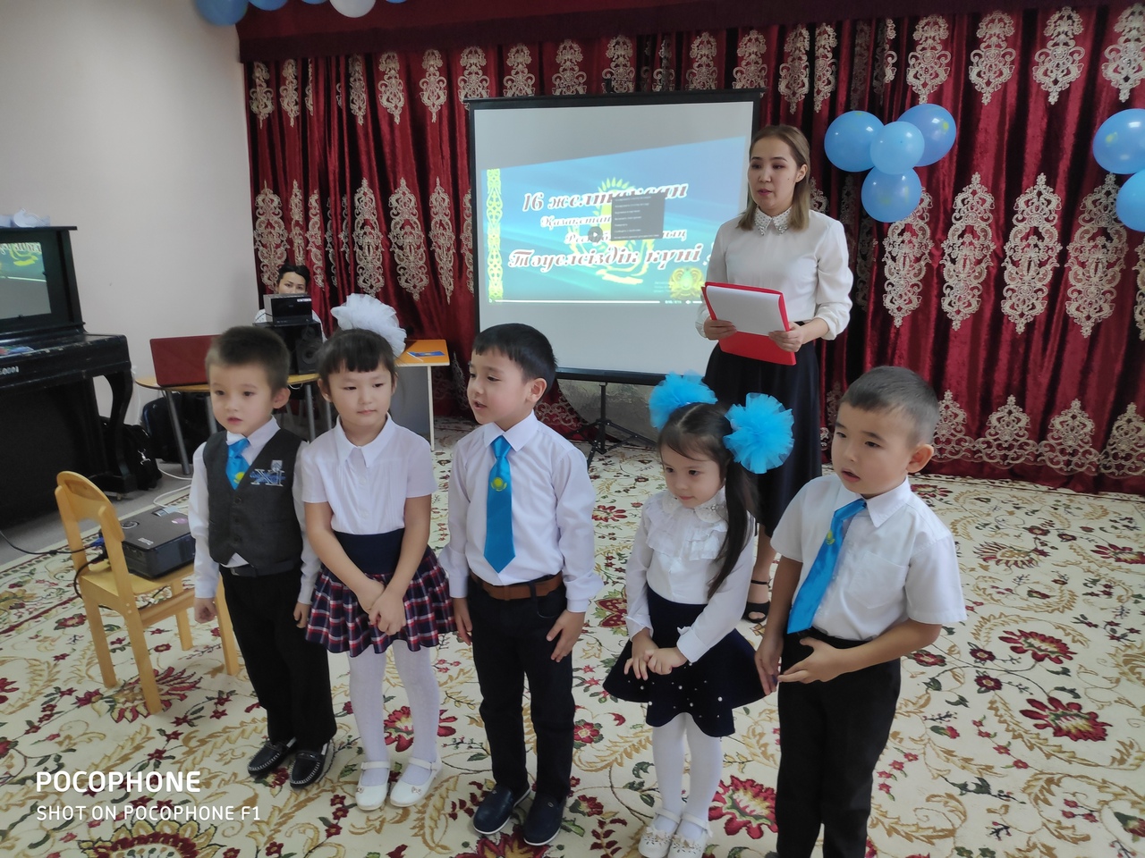 Жүргізуші: Біз бүгін тәуелсіздік алған күнімізді мерекелеудеміз. Біздің еліміз тәуелсіз болғандықтан өз мемлекеттік Әнұраны, Елтаңбасы және өзінің мемлекеттік туы бар. Балалар, мемлекеттік туымыздың түсі қандай екен?